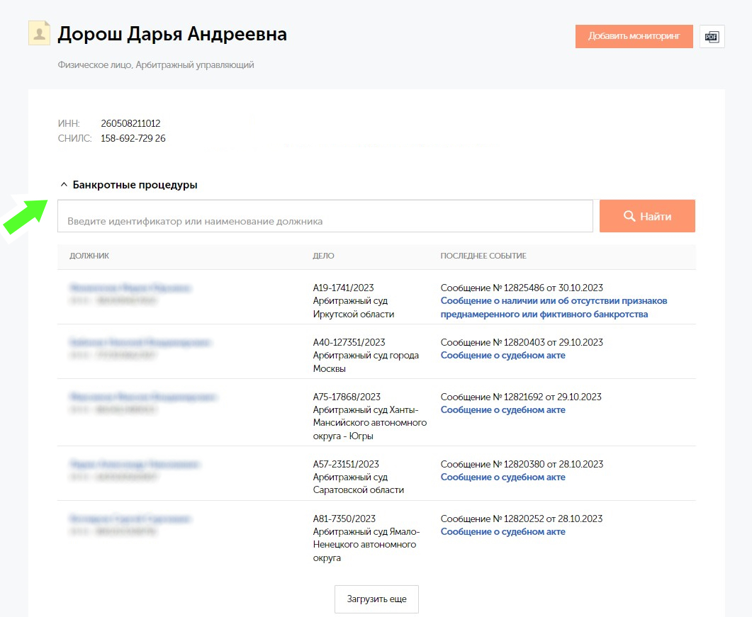 Гораздо удобнее пользоваться этим ресурсом для проверки уже взятого на заметку исполнителя. В частности, можно убедиться, что он предоставил достоверные сведения о наличии профессионального статуса, действующем членстве в СРО и опыте работы. И, конечно, ознакомиться с результатами его деятельности по карточкам банкротств.