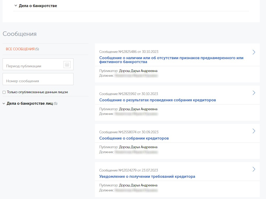 У всех банкротных дел есть собственные карточки, где публикуются значимые детали о процессе: