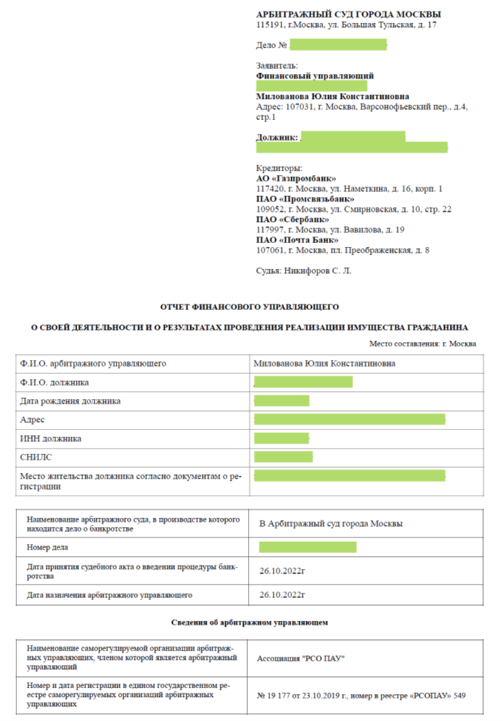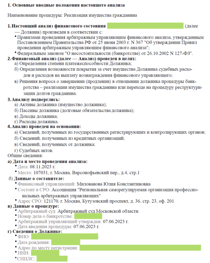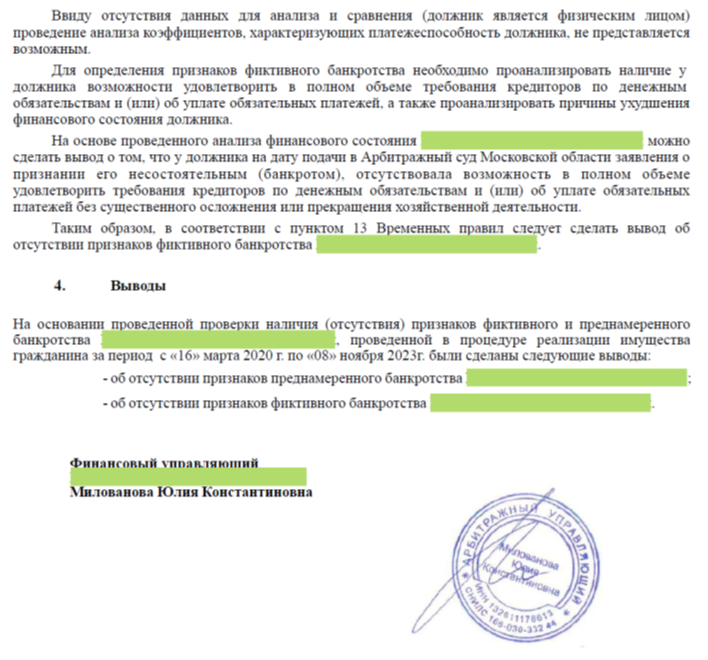 Заключение финансового управляющего: примеры