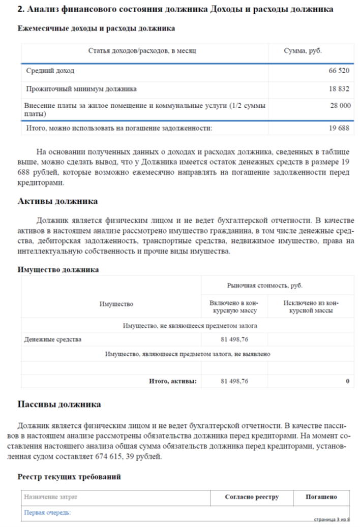 После проведения анализа финансового состояния должника управляющий готовит отчётность для суда и собрания кредиторов. Приведём пример комплексного заключения: