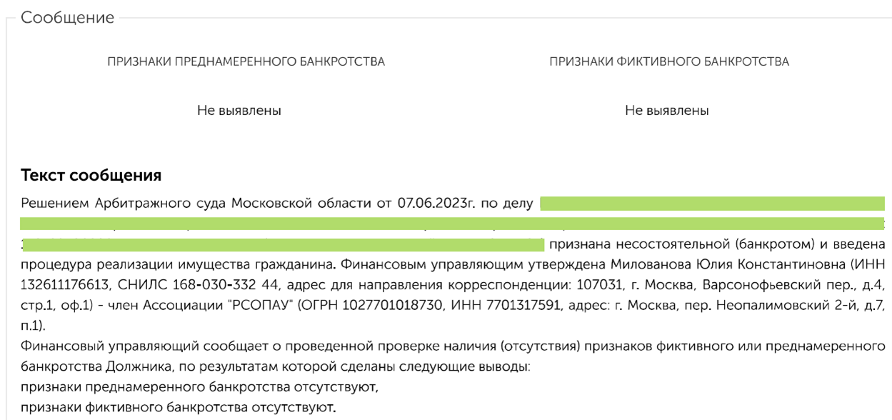 На основании выводов из такого заключения финансовый управляющий публикует короткое открытое сообщение в онлайн-реестре ЕФРСБ:
