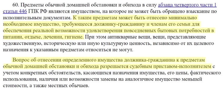 Вместе с тем, судебный пристав ограничен в изъятии отдельных, жизненно важных для гражданина и его семьи видов имущества. Они перечислены в статье 446 ГПК РФ. Сюда в том числе относятся: