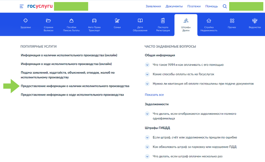 Но как только в ФССП на основании приказа будет возбуждено исполнительное производство, всю информацию о его ходе можно получать через личный кабинет на портале. Для этого переходим в раздел, посвящённый задолженностям: