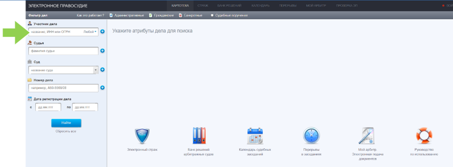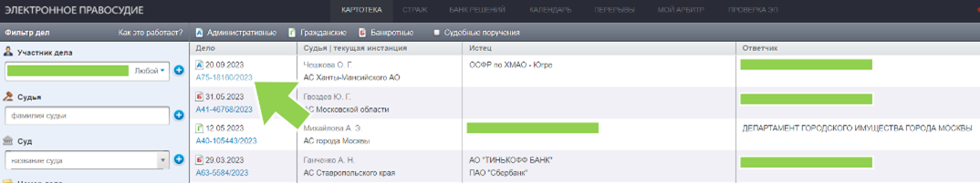 В результатах появятся все связанные с названным лицом арбитражные споры, номера дел и их участники: