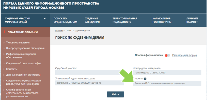 В Москве ситуация обстоит иначе: в столице действует единый онлайн-портал мировых судей. На сайте есть специальный раздел, посвящённый поиску дел: