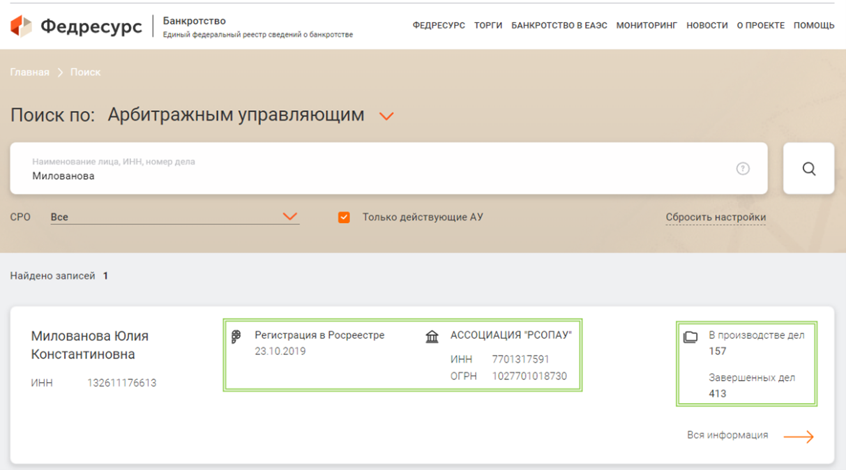 Это общедоступная Интернет-площадка, на которой аккумулируются все сведения о банкротствах в России. Здесь можно найти массу полезной информации об интересующем арбитражном управляющем. Достаточно выбрать нужный раздел и ввести его фамилию или ИНН: