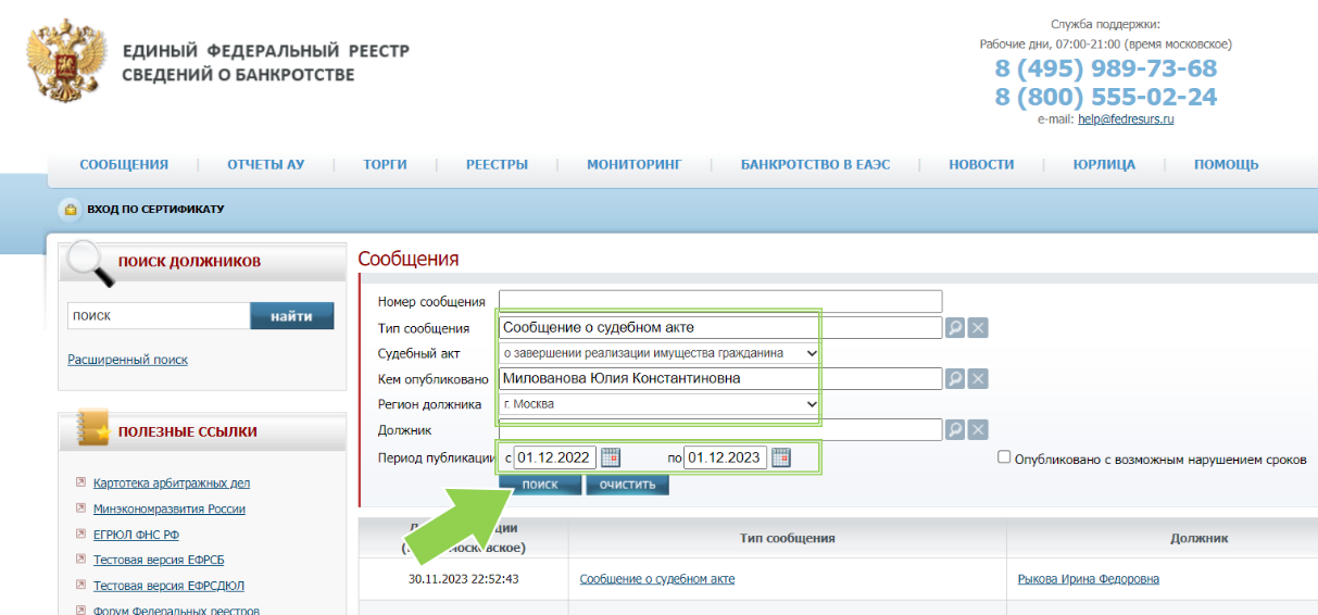 Для точечного исследования пригодится старая версия ресурса. Здесь можно более гибко фильтровать данные: выбирать тип сообщения, регион, период. Приведём пример, как найти все завершённые кандидатом банкротные дела физических лиц за последний год для должников из Москвы: