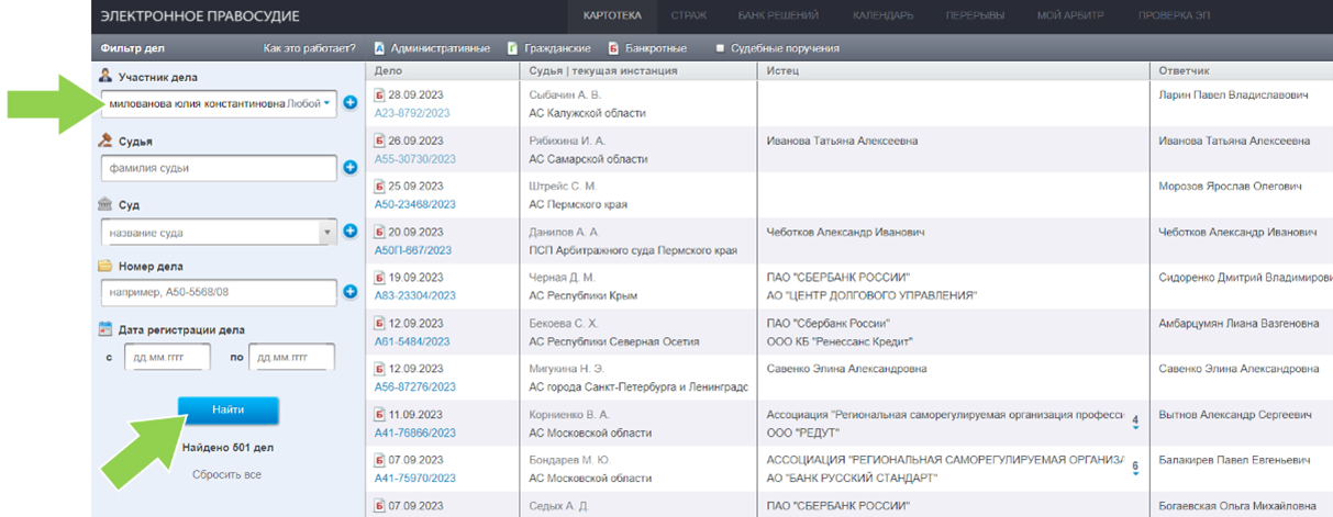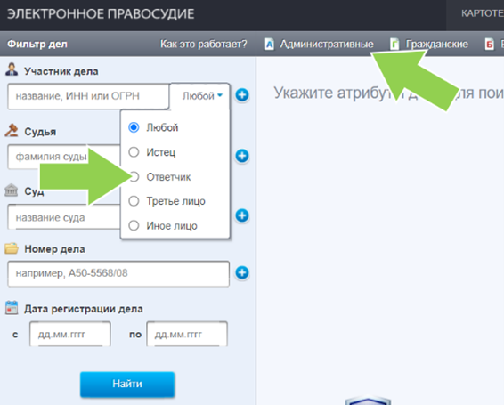 Картотека арбитража предоставляет ещё одну полезную возможность. Если в строке «Участник дела», помимо ФИО кандидата, уточнить статус «Ответчик» и выбрать категорию «Административные», можно увидеть дела, в которых исполнителя пытались привлечь к административной ответственности за нарушения.