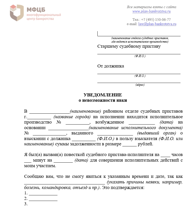 описание уважительных причин, по которым должник не может явиться в отдел в указанное время;